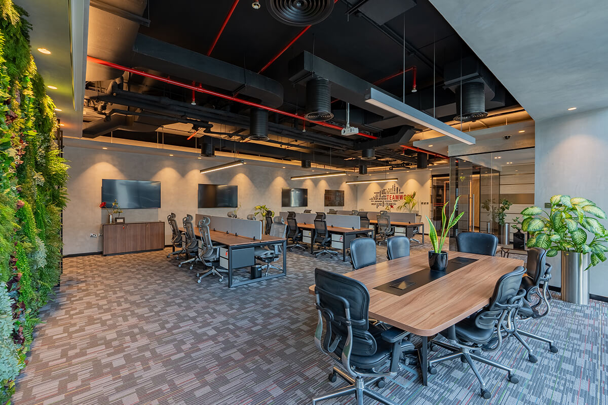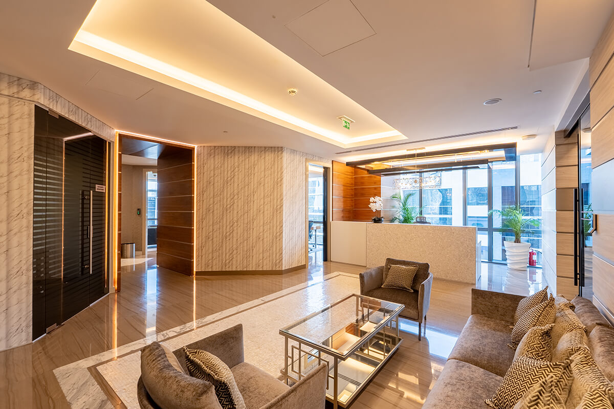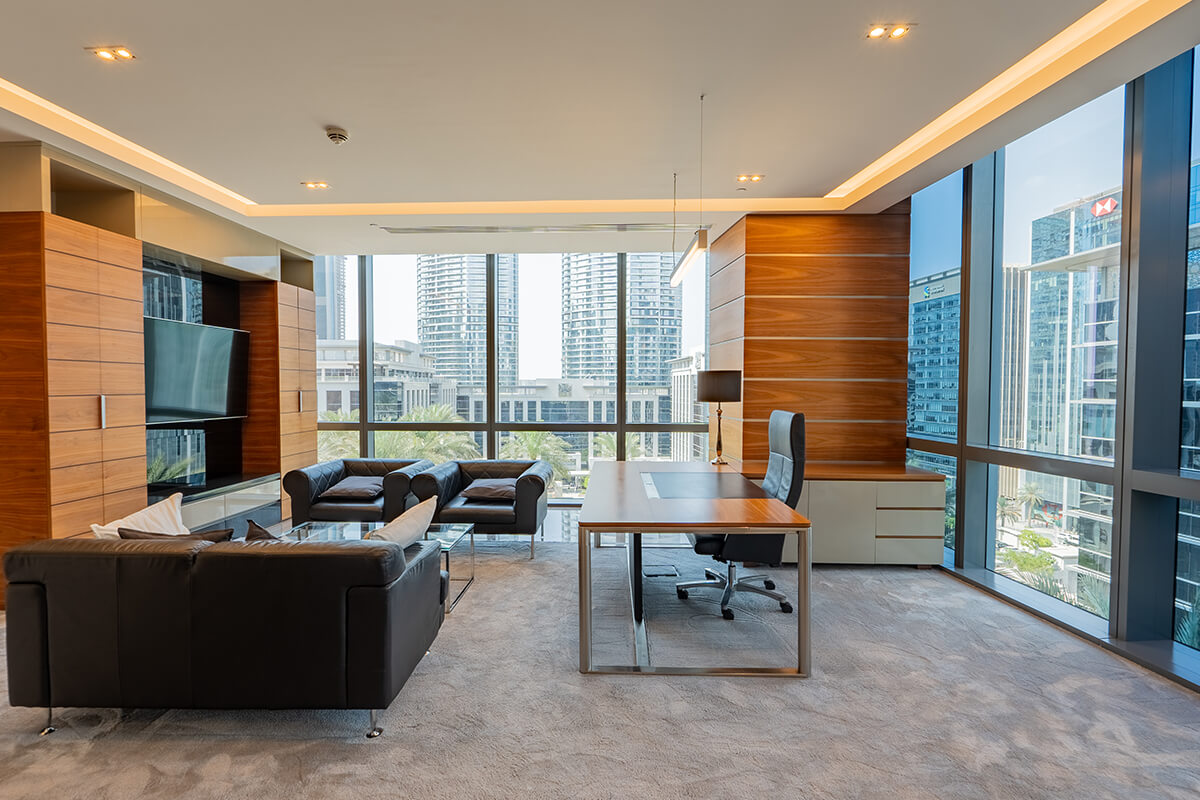 Located in the heart of Downtown Dubai, Boulevard Plaza is a 3,371 sq. ft. office space that was meticulously planned and executed, from the architectural drawings to the complete interior design and furnishing. The space features a welcoming reception area, four private offices, and a large open-plan co-working space. The floor-to-ceiling windows not only flood the space with natural light but also offer expansive views of Downtown Dubai. The project successfully combines functional design with aesthetic appeal, creating a workspace that inspires productivity and fosters collaboration.