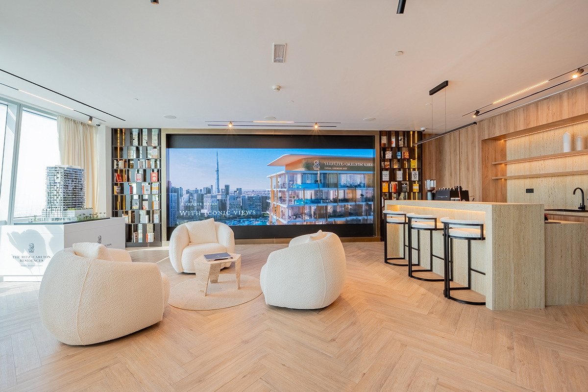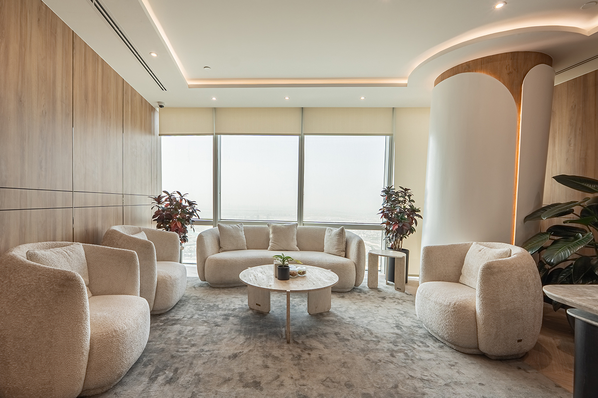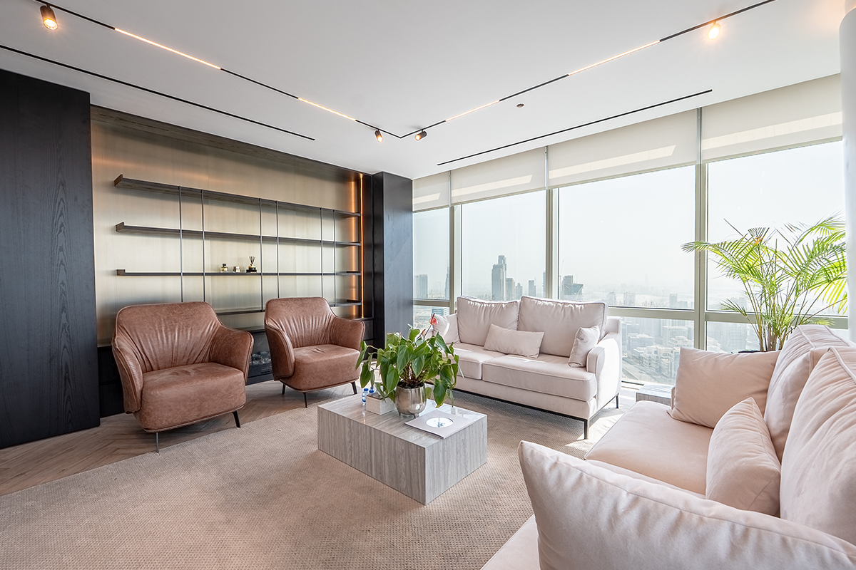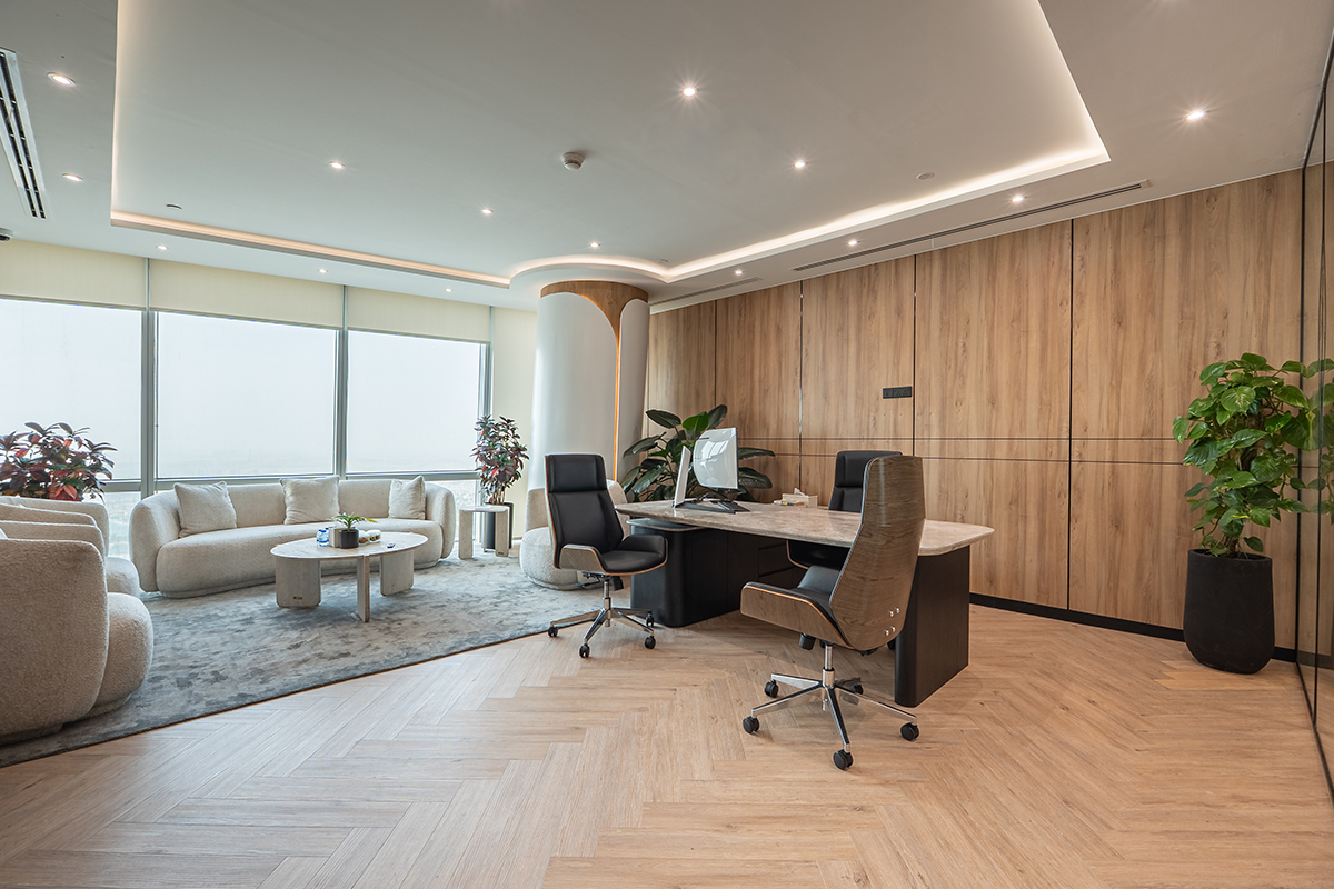 This 6,657 sq.ft. office in Business Bay, Dubai, underwent complete architectural planning and interior design. The luxurious workspace combines premium office furniture and fittings with natural light streaming through high ceilings and expansive windows, offering unobstructed views of the Burj Khalifa, Dubai Water Canal, and city skyline.