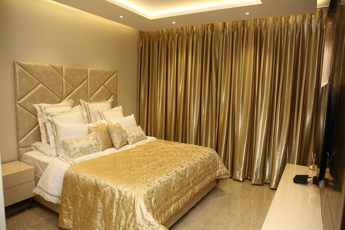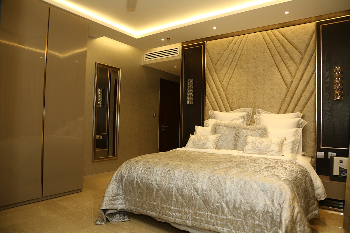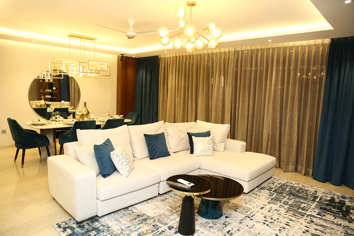 A 1,496 sq.ft. apartment in Goregaon East, Mumbai, featuring warm, inviting lighting and interiors accented with golden tones. The complete renovation and interior design create a balance of luxury and elegance. Each room feels welcoming, with bespoke details and high-quality finishes that add character and sophistication.