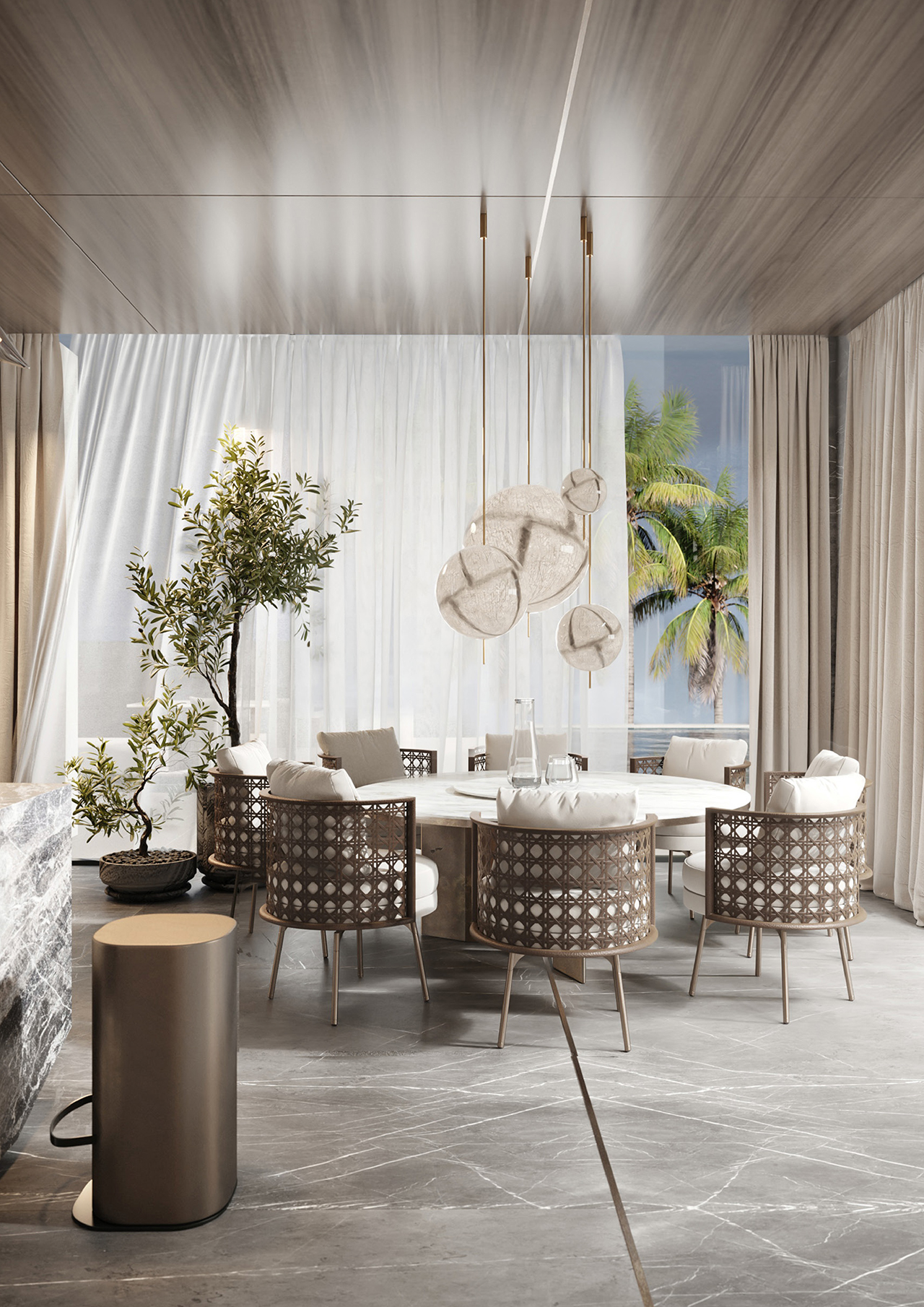 Situated on Dubai’s iconic Palm Jumeirah, this 16,930 sq.ft. six-bedroom villa is currently under development as a full turnkey project. The villa’s design focuses on expansive open-plan interiors, double-height spaces, and floor-to-ceiling glazing. Rich natural finishes, bespoke detailing, and curated furnishings create a calm yet striking atmosphere.